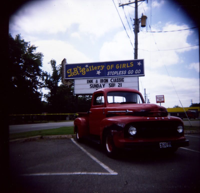 ![]() ![]() Couple pics I took with my Holga/Polaroid: 1. More of my distressed/imperfect lettering on a tank we did. 2. Shot of my buddy's '52 at a recent bike/rod show at the local strip club parking lot. |